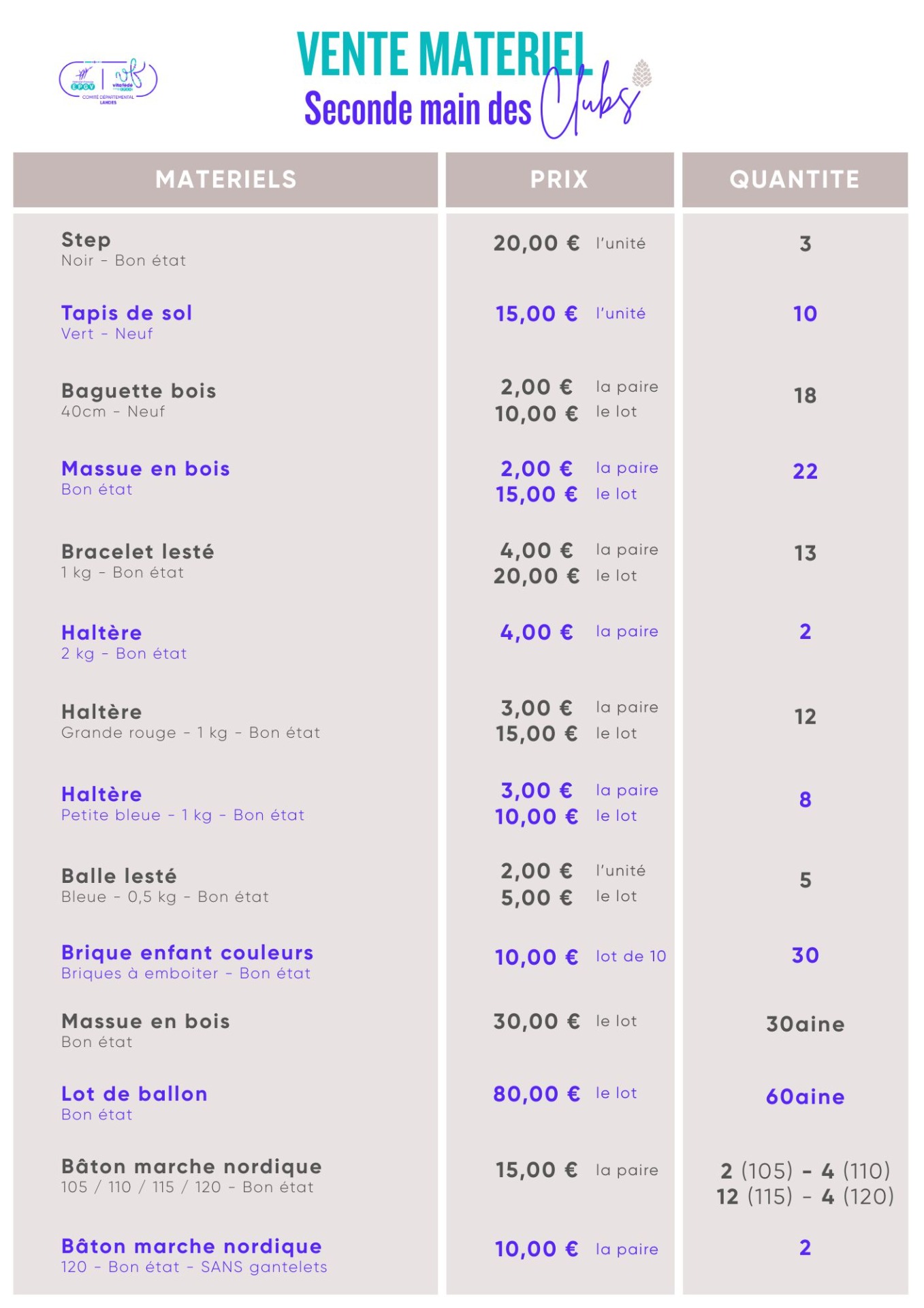 Dans le tableau ci-dessous, le matériel actuellement disponible à la vente